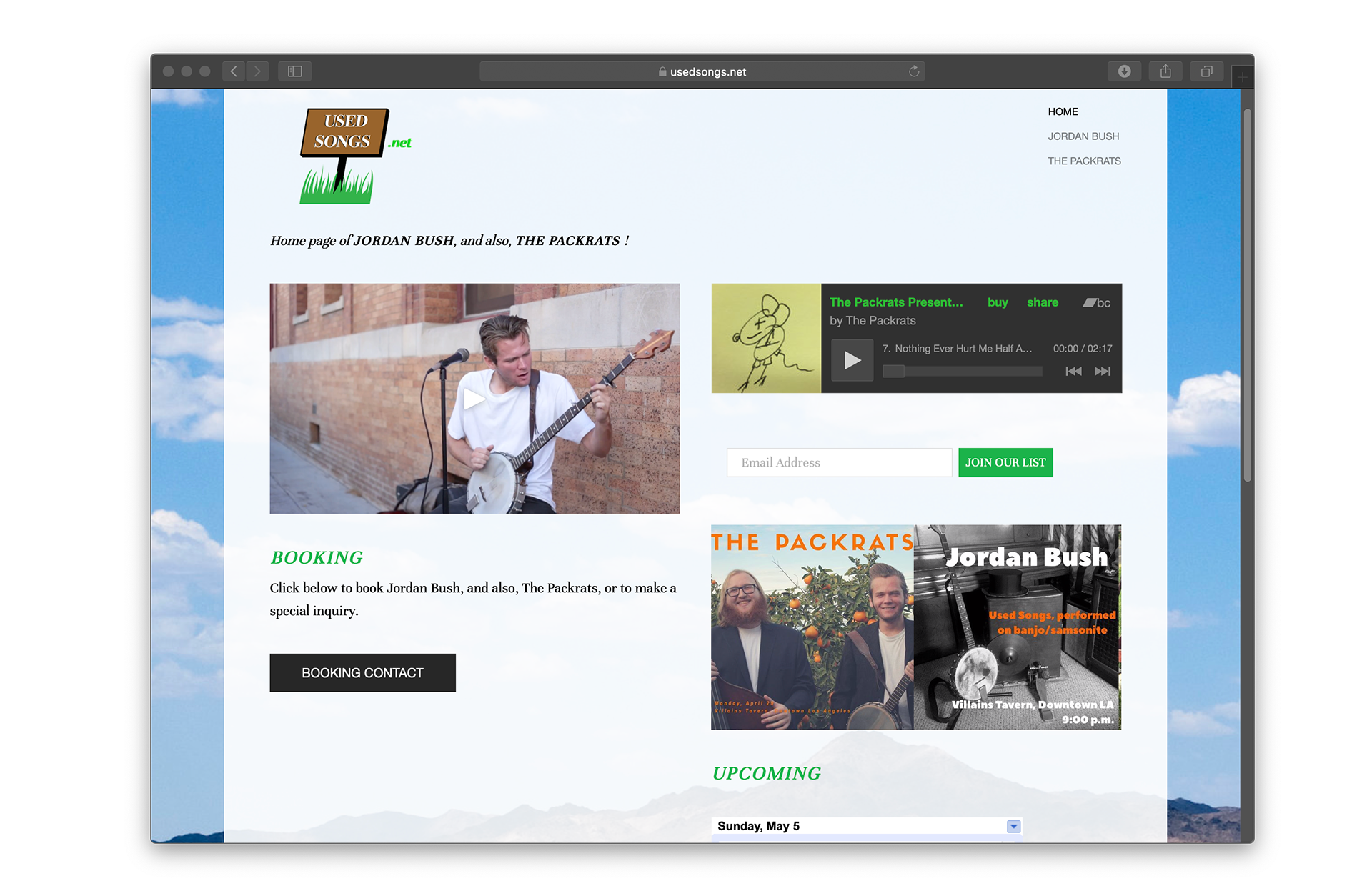 UsedSongs.net is the home page for Jordan Bush, a musician based in Los Angeles. Modest in its design, but effective nevertheless, the page is a nod to a simpler time. Jordan Bush is a multi-instrumentalist, active member of numerous LA-based groups, and a talented solo performer. For more info on Jordan, please visit UsedSongs.net.